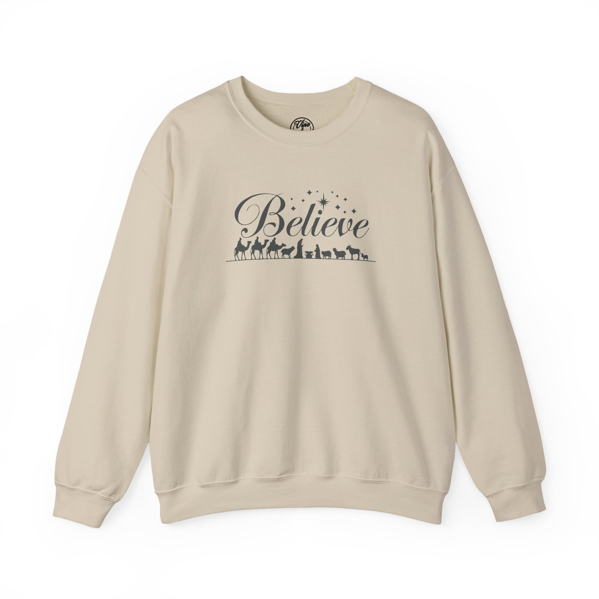 This sweatshirt beautifully celebrates the heart of the Christmas story, with the word "Believe" elegantly scripted above a silhouette of the Nativity scene, featuring Mary, Joseph, baby Jesus, and the journey of the wise men. The design is accented with subtle stars, reminding us of the miraculous night when Christ was born. Perfect for sharing your faith and reflecting on the hope, peace, and joy that Jesus brings, this piece is a meaningful way to point others to the true reason for the season. Wear it as a declaration of your belief in the Savior who came to bring light into the world.