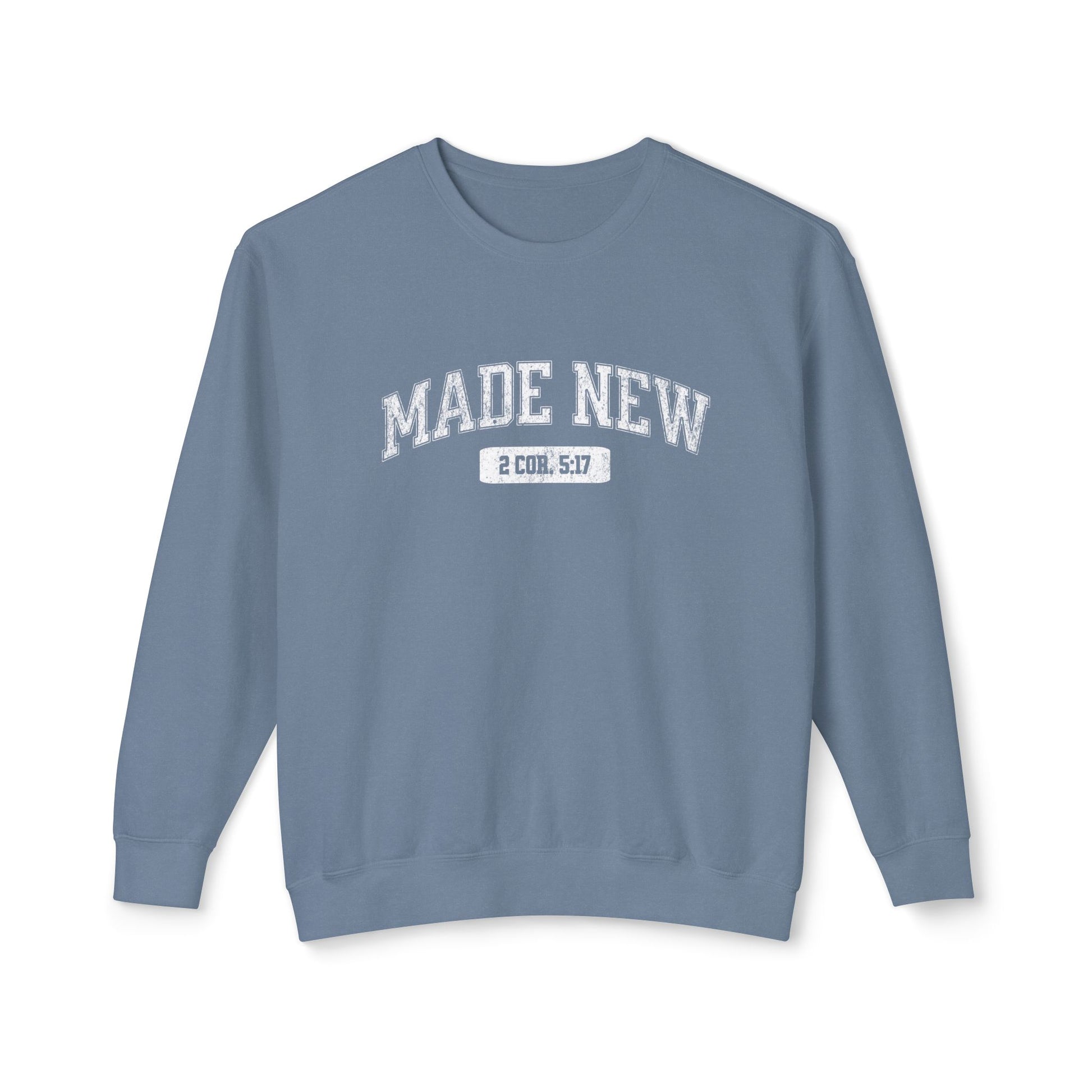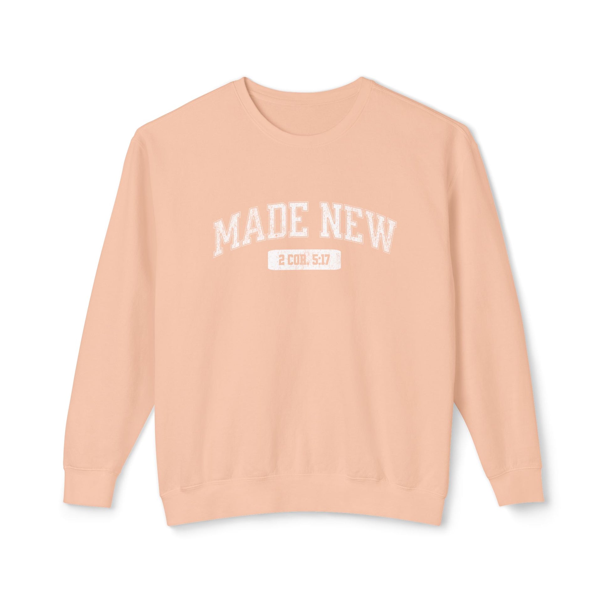 This lightweight crewneck sweatshirt wears like a warm conversation. Soft, breathable ring-spun cotton feels gentle against the skin while a relaxed silhouette drapes easily over weekend layers. The subtle “MADE NEW” varsity-style graphic (soft-printed in tonal ink) keeps the look calm and quiet — a small statement that carries big meaning. It’s the kind of sweatshirt you reach for on slow mornings, sheltering chilly walks, or when you want comfort without bulk. Thoughtful details — ribbed cuffs and hem that bounce back, shoulder and neck twill for durability, and a clean tubular knit — keep the piece feeling intentional and long-lived.