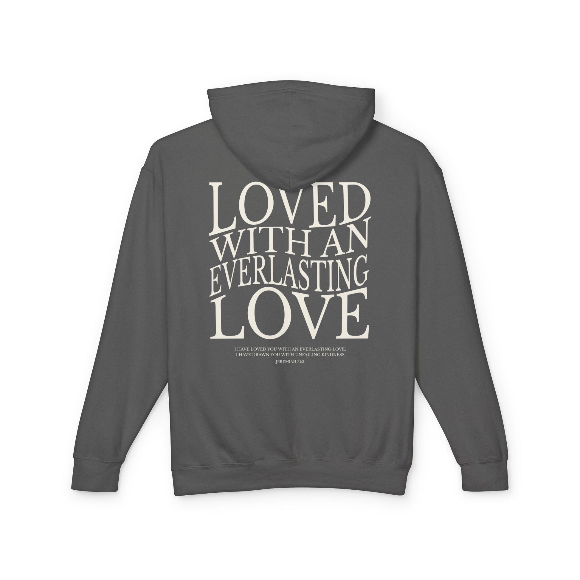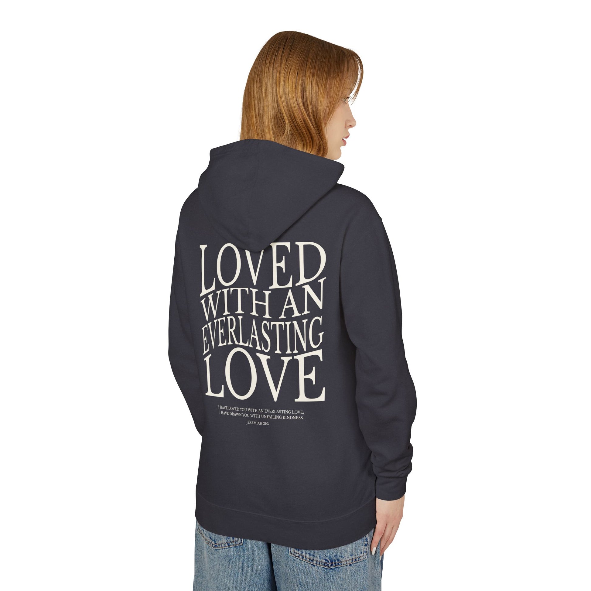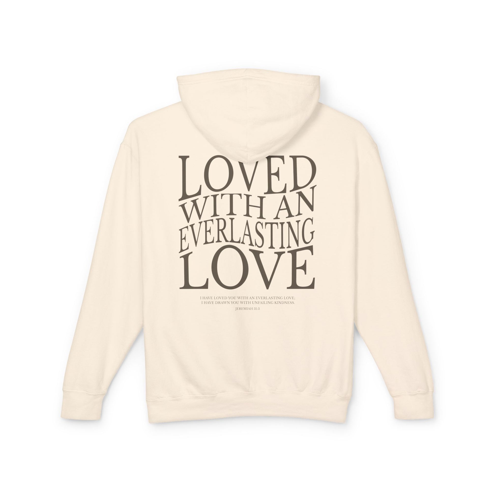 A warm, hoodie that feels like a quiet hug. Soft ring-spun cotton with a medium-heavy weight drapes in a relaxed silhouette. Subtle front text and a bold back message — “LOVED WITH AN EVERLASTING LOVE” — make this piece both gentle and expressive. Details like ribbed collar, cuffs and hem, neck twill tape, and a half-moon back patch keep it comfortable and durable. OEKO-TEX low-impact dyes and the option for delicate chest embroidery add thoughtful finishing touches. Wear it at home during slow mornings, layered for church gatherings, or out for cozy walks on cool evenings.