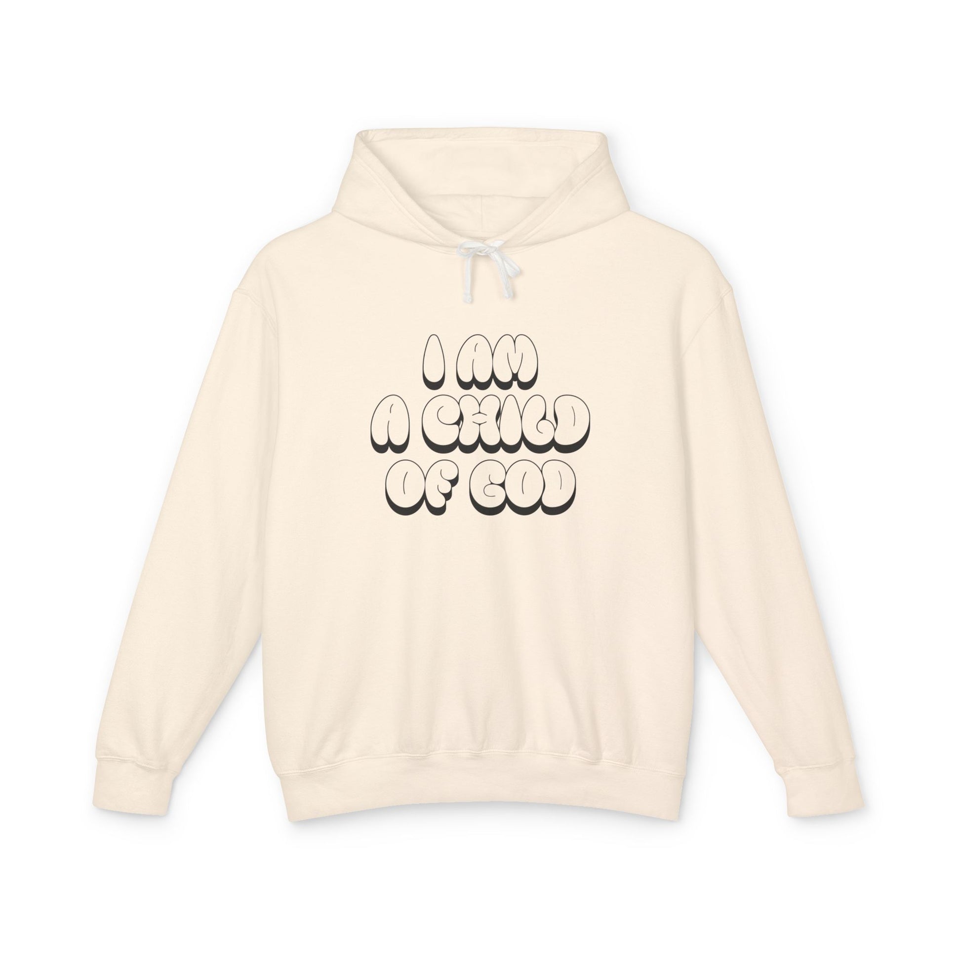 Soft, airy fleece with a joyful, retro message—this lightweight hoodie reads “I AM A CHILD OF GOD” in playful, rounded lettering. It feels like a quiet morning: warm enough for a stroll to the coffee shop, breathable enough for layering under a coat. The natural cream tone and simple front-center print keep the look calm and sincere. Rolled-forward shoulders and a relaxed cut give room to move; a jersey-lined hood with a flatcord adds a soft, vintage touch. It’s made from 100% ring-spun US cotton with OEKO-TEX low-impact dyes and supports sustainable cotton farming through the U.S. Cotton Trust Protocol. Wear it when you want something gentle, honest, and easy to live in.